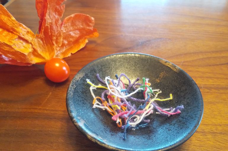 写真は、お迎え火焚く用のお皿とかわいい薪(カラフルローソクの芯)